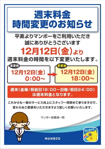 マンボー全店 週末料金時間変更のお知らせ