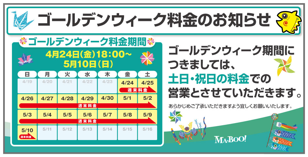 ※休日料金は金・祝前は18時以降、土・日・祝日に適用されます。予めご了承ください。