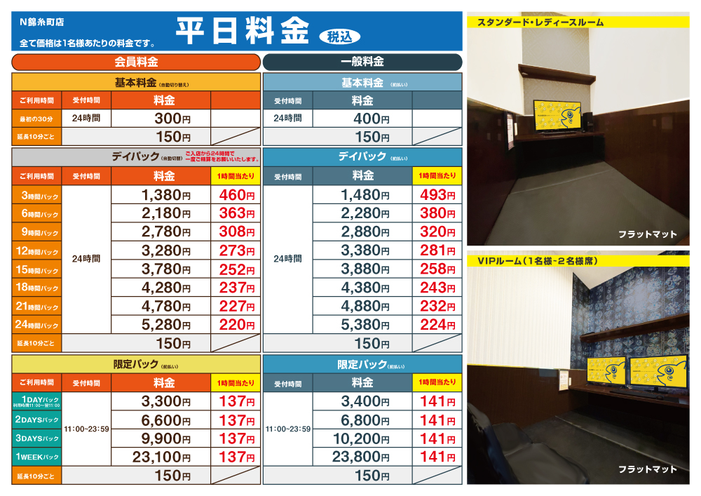 ※VIP平日、VIP休日の料金につきましては、VIPルーム1名様でご利用された場合の金額となります。