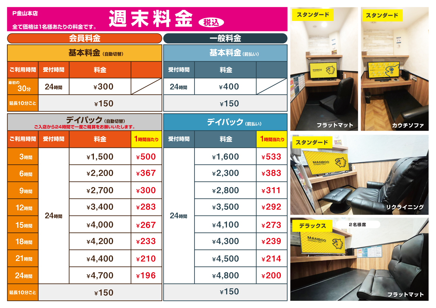 ※休日料金は金・祝前は18時以降、土・日・祝日に適用されます。予めご了承ください。