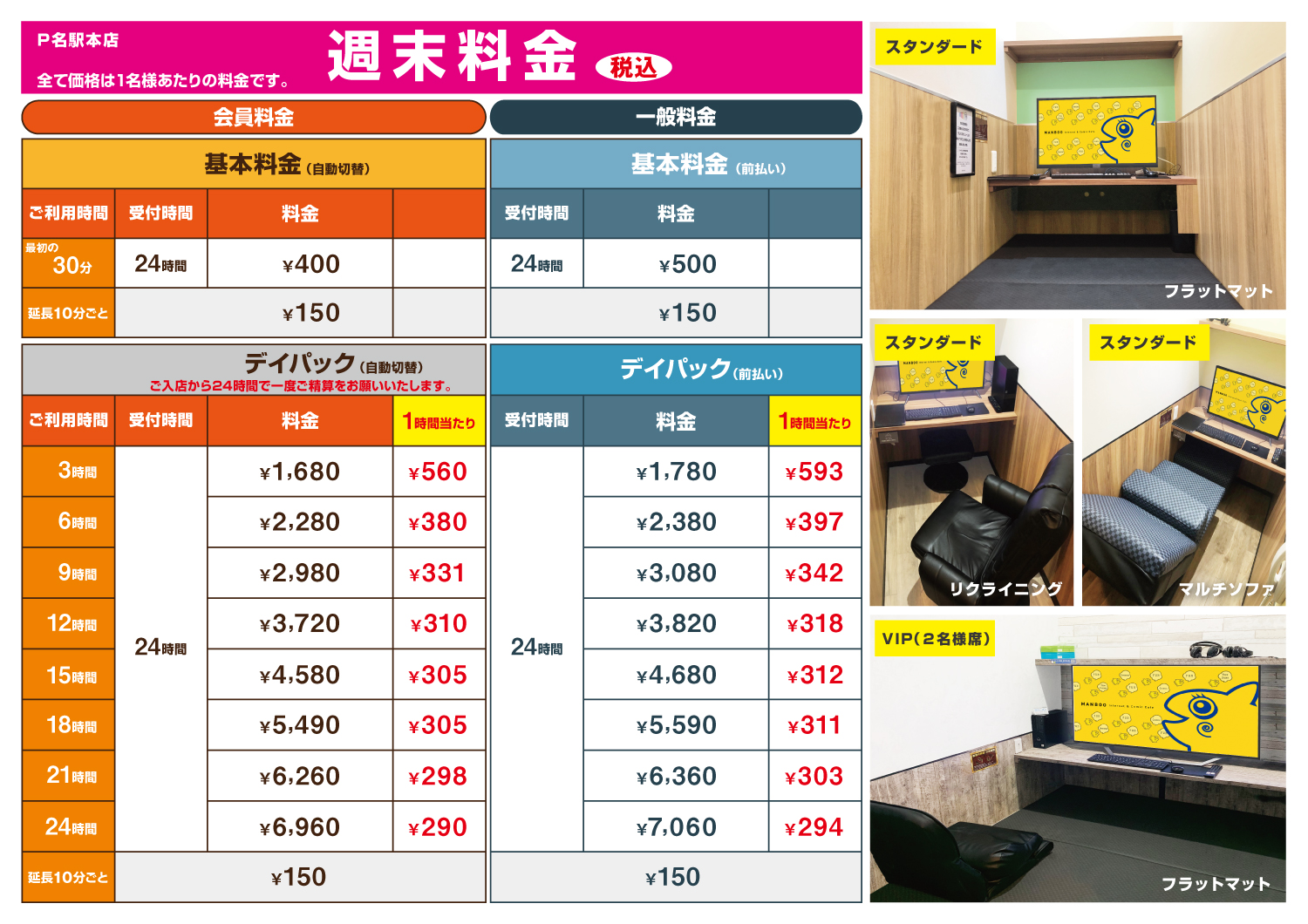 ※休日料金は、金・土・日・祝前・祝日に適用されます。予めご了承下さい。