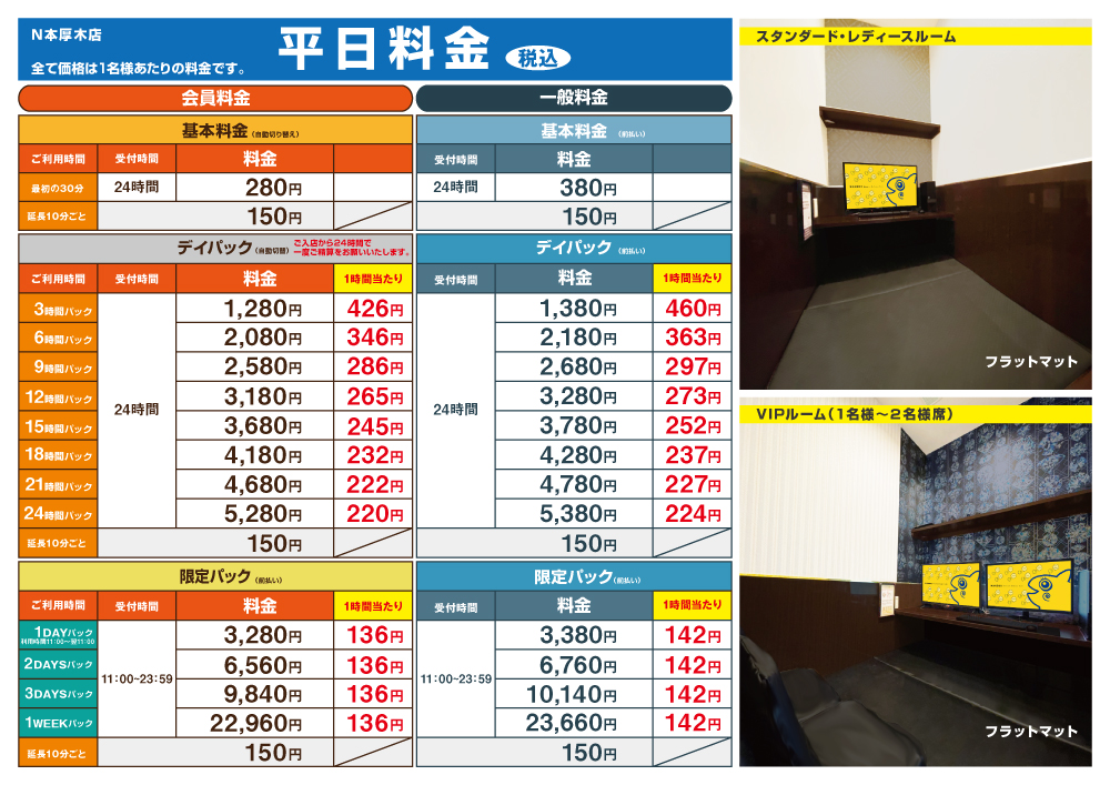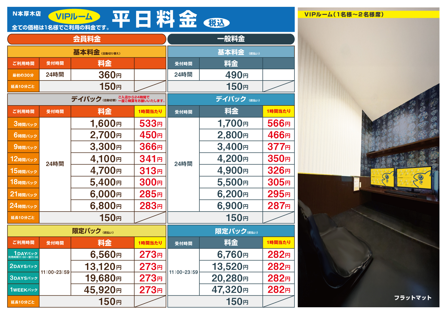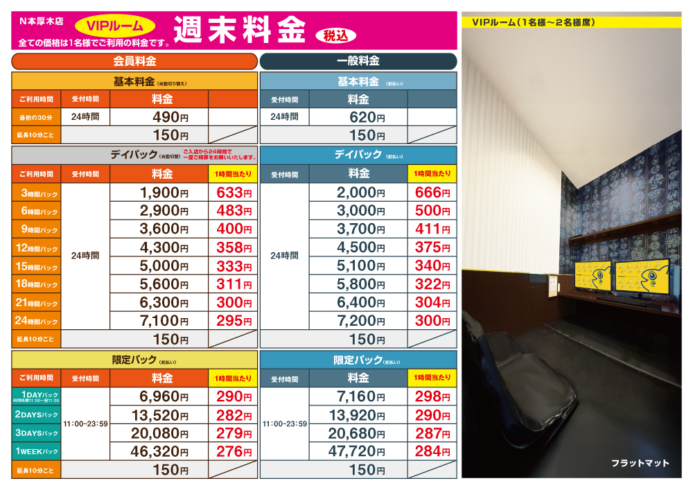 ※VIP平日、VIP休日の料金につきましては、VIPルーム1名様でご利用された場合の金額となります。