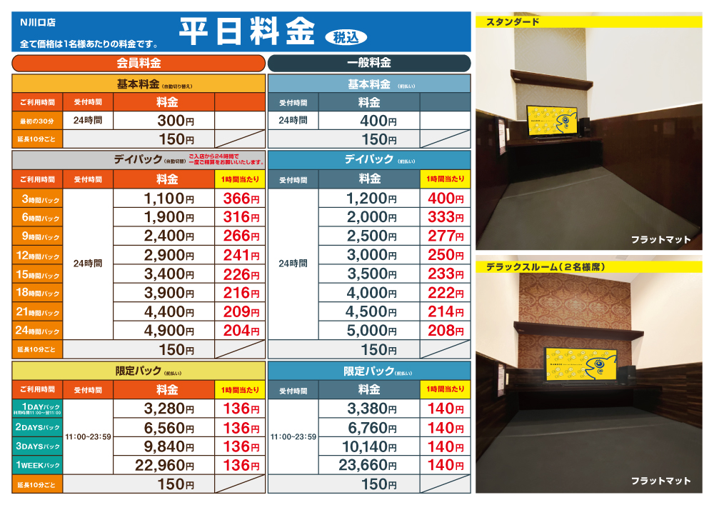 ※休日料金は金・祝前は18時以降、土・日・祝日に適用されます。予めご了承ください。