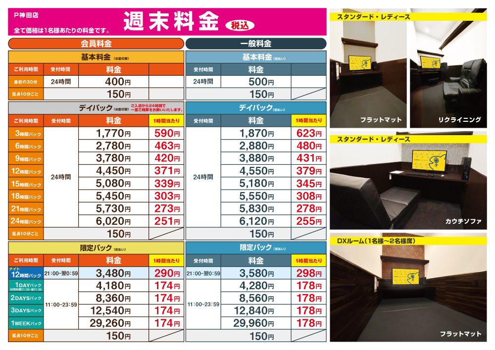 ※休日料金は金・祝前は18時以降、土・日・祝日に適用されます。予めご了承ください。
