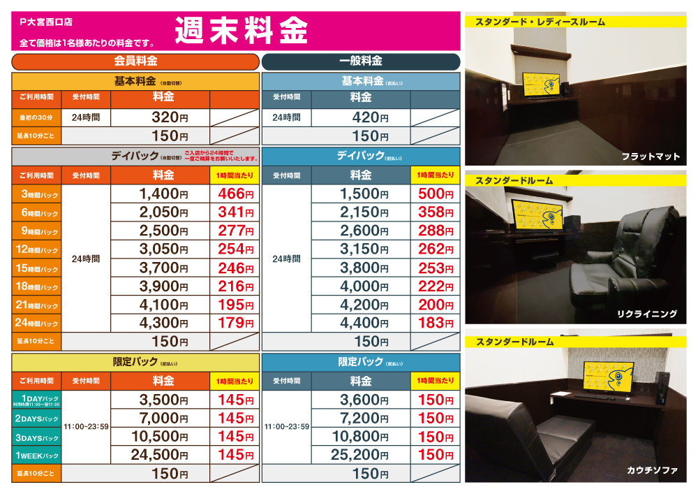 ※休日料金は、金・土・日・祝前・祝日に適用されます。予めご了承下さい。